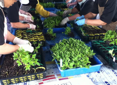 花の苗をポットに分けました。 雨も上がり、大曽公園にて花の苗を植え替える作業が行われました。 市内各地区の花壇を管理するコミュニティ団体の皆さん、総勢120名くらいが集まり、ポットに土を入れる作業、水をかける作業、苗を一…