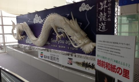 所用があり、セントレアにいきました。 スロープを上り、3階まで行くと大きな「昇龍道」の文字と、巨大な龍のオブジェが目に入ります。福井県越前市が観光PRのために、越前和紙で作った広告でした。これぐらいやるとやはり迫力があり…
