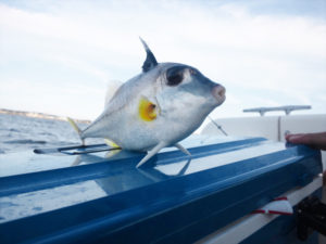 自分に釣りの腕はなく、キスがちょいちょいと釣れただけでしたが、同行者が「本ギマ」というのを2匹釣りあげていました。カワハギみたいなものです。