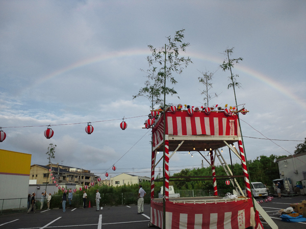 当日早朝の準備での綺麗な虹と櫓