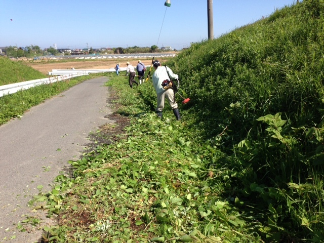 地元の榎戸区では一斉清掃を午前6時から行い、8時30分からは区の管理する水路の草刈りを行うのが恒例です。ボタ焼きで綺麗になった草も、夏を迎えるにあたり、すでにボーボーに茂っていました。
