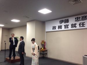 県議・各市町議長の発起により開催されましたが、多くの皆さんにお出かけいただき、盛大に開催されていました。また、参議院議員の藤川政人先生にもお出かけいただき、両政務官を祝福することができました。