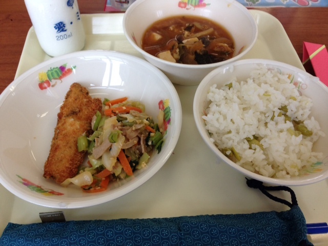 自分は3年2組で児童たちと楽しく給食を頂きました。本日のメニューは、枝豆ご飯、カマスのフライ、野菜とアーモンドの炒め、具たくさんの味噌汁、牛乳でした。フライの衣にはあかもくが入っているなど、地元の食材をふんだんに使った給食でした。