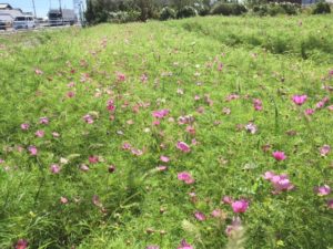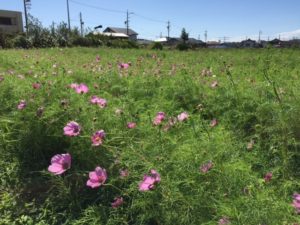 地域保全隊で管理するコスモス畑も、やや斜めになっているのもありましたが、元気にコスモスが咲いていました。