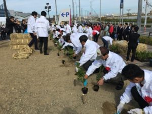 市民の皆さんが1000人以上参加し、敷地周りにパーティーに分かれて植えました。