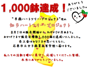 何度となくご紹介している半田商業高校のハートツリープロジェクト、当面の目標である1,000鉢の売り上げを達成しました!